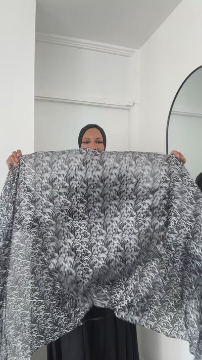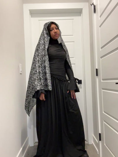 Made from luxurious silk satin fabric and featuring a custom Arabic calligraphy print, this shayla is bold and means: Hijabi, High Status, and Modesty —literally!